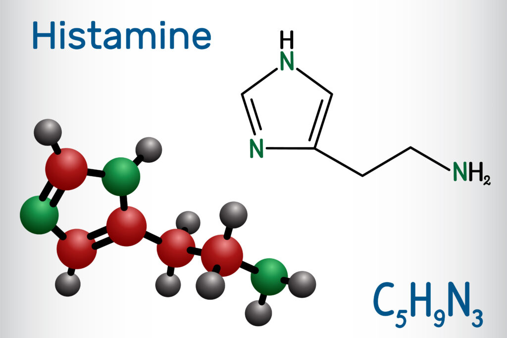 L’histamine est une molécule naturelle (une amine biogène) qui joue des rôles essentiels dans le corps : régulation du système immunitaire, de la digestion, de la transmission nerveuse…